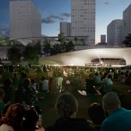In the heart of the district, a new topography with elevated edges forms the “Central Green”- a meadow flexible enough to accommodate a variety of outdoor events, ranging from a 200- to 10,000-person capacity. The Central Green will feature a pair of responsive environmental sculptures: “Permanent Sun” will reflect sunlight onto areas perpetually cast in shadow using an array of pivoting heliostats; while “Permanent Shadow” will provide a consistent area of reprieve from harsh sun, using a hovering 22-diameter disk.